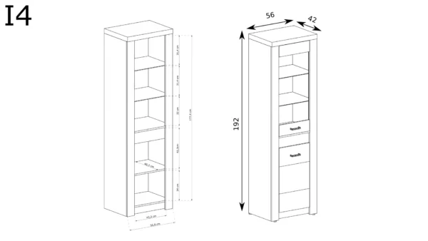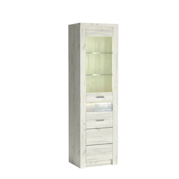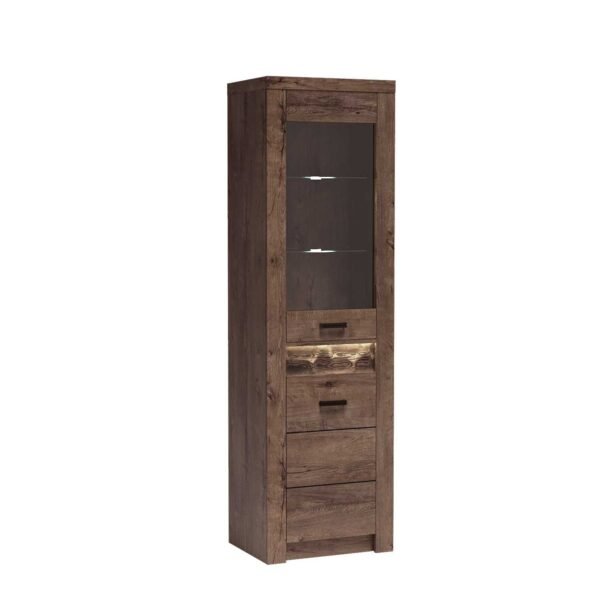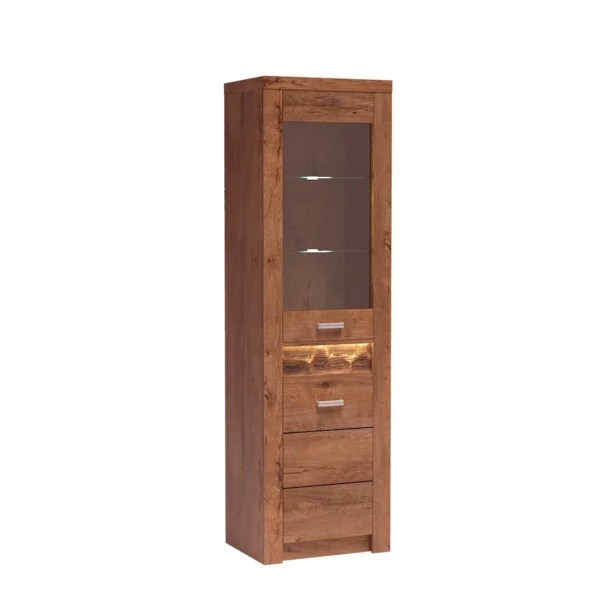 Υψηλή βιτρίνα, με δύο γυάλινα ράφια και μια ντουλάπα από κάτω. Διατίθεται με γυάλινη ή πλήρη πρόσοψη. Υπάρχει επίσης επιλογή φωτισμού LED για την επιφάνεια εργασίας και τα ράφια. Επιπλέον δυνατότητες θα εμπλουτίσουν το εσωτερικό. Χωράει πολλά ρούχα, αξεσουάρ, βιβλία ή έγγραφα. Η βιτρίνα είναι ιδανική για να εκθέτει διακοσμητικά, πορσελάνες ή αναμνηστικά. Διαθέσιμη σε τρεις αποχρώσεις. Καρυδί, βέγκε, λευκό