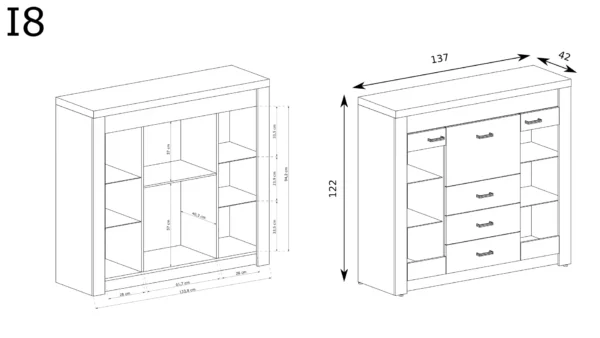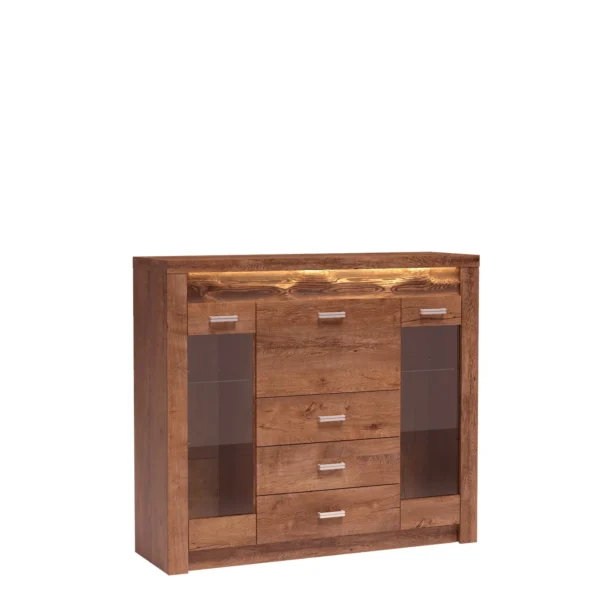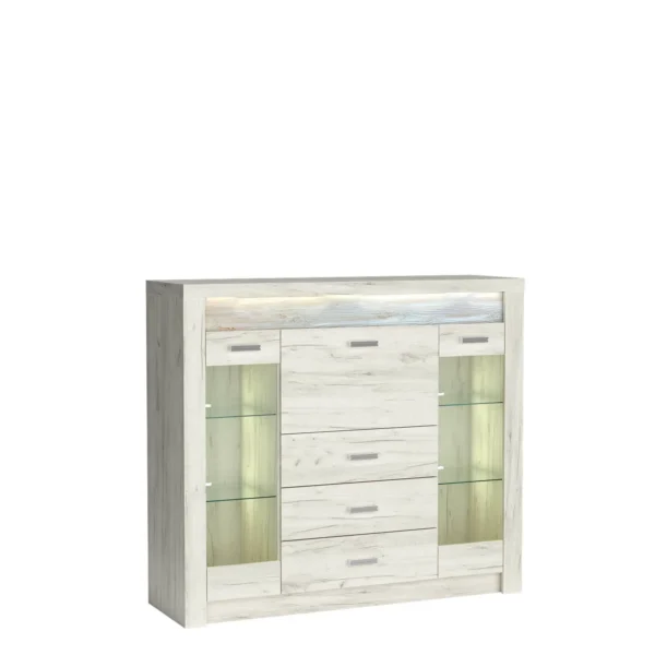 Υψηλή ντουλάπα με βιτρίνες στα πλάγια και διπλά γυάλινα ράφια στο εσωτερικό. Στο κέντρο έχουμε τρία βαθιά συρτάρια και μια μπάρα. Οι βιτρίνες είναι ιδανικές για να εκθέτουν βιβλία, πορσελάνες ή αναμνηστικά. Το έπιπλο χωράει πολλά, είναι ευρύχωρο και πρωτότυπο όσον αφορά την εμφάνιση. Θα ταιριάξει σε κάθε δωμάτιο, σαλόνι, τραπεζαρία ή χολ. Θα προσελκύσει την προσοχή κάθε επισκέπτη με το κομψό του σχέδιο. Οι μεταλλικές λαβές τονίζουν την προσοχή στη λεπτομέρεια. Δυνατότητα αγοράς του επίπλου με πλήρεις πρόσοψεις. Διαθέσιμο σε τρία χρώματα. Καρυδί, λευκό, βέγκε