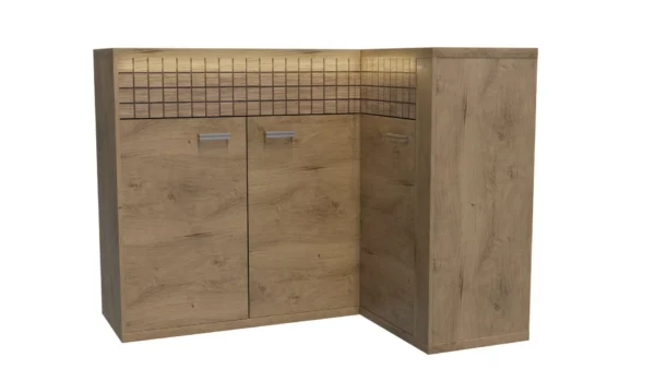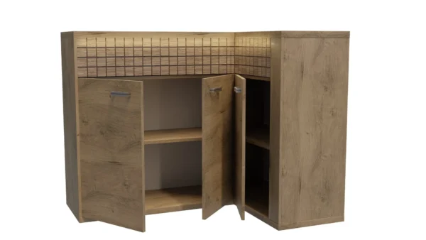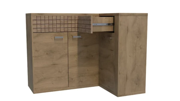 Γωνιακός μπουφές από τη συλλογή Natural, που ταιριάζει τέλεια σε κάθε χώρο. Κατασκευασμένο από ανθεκτική laminate πλάκα, θα προσαρμοστεί σε κάθε σύνθεση και μπορείτε να δημιουργήσετε ακόμη περισσότερα μαζί του. Διαθέτει τρεις ντουλάπες, οι οποίες είναι συνδεδεμένες και έχουν μία κοινή ραφή, ενώ η τρίτη ντουλάπα έχει επίσης μία ραφή που χωρίζει τον χώρο στα δύο. Πάνω από τις ντουλάπες υπάρχουν δύο συρτάρια με σύστημα Push To Open, το οποίο αναδεικνύει τη λεπτότητα του επίπλου. Με αυτό τον μπουφέ, η οργάνωση είναι ευχαρίστηση. Οι μεταλλικές λαβές καθώς και το αθόρυβο κλείσιμο των ντουλαπιών δείχνουν ότι κάθε λεπτομέρεια έχει φροντιστεί. Διατίθεται σε μία απόχρωση.