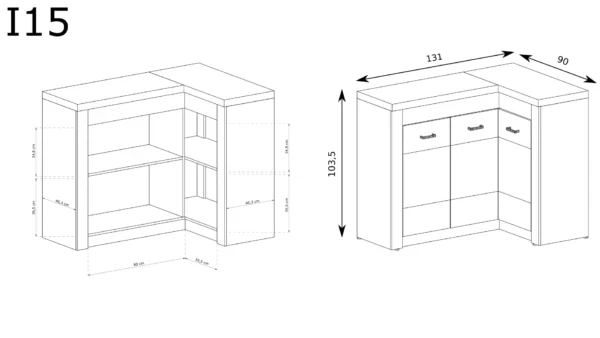 Γωνιακή κονσόλα από τη συλλογή Indianapolis. Οι ντουλάπες στην αριστερή πλευρά είναι συνδεδεμένες και σχηματίζουν ένα ενιαίο σύνολο. Περιέχει ένα ευρύχωρο ράφι όπως και στην δεξιά πλευρά. Η κονσόλα προσφέρει πολλές δυνατότητες χρήσης. Είναι ευρύχωρη, χάρη σε αυτήν η οργάνωση είναι πολύ εύκολη, η κονσόλα προσαρμόζεται σε κάθε γωνία. Υπάρχει επίσης διαθέσιμη η ανάποδη έκδοση του επίπλου. Οι μεταλλικές χειρολαβές ενσωματώνονται ιδανικά στο σύνολο του επίπλου, δείχνοντας πόσο προσεκτικά έχει σχεδιαστεί κάθε λεπτομέρεια. Διαθέσιμη σε τρία χρώματα. Βέγκε, Καρυδί, λευκό.